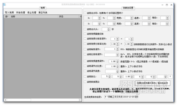 短视频批量伪原创处理系统是一款可以去除视频水印的工具,本工具能够批量解决从网上获取的视频水印问题,支持改变片头、分辨率、播放速度等,有需要的可以下载。
