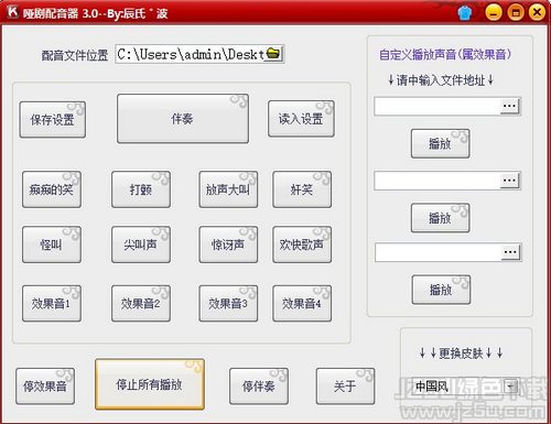 如:配置文件位置:D:\音乐\,按钮名为效果音1,则单击此按钮,将播放D盘音乐文件夹里名为效果音1.MP3的音乐文件