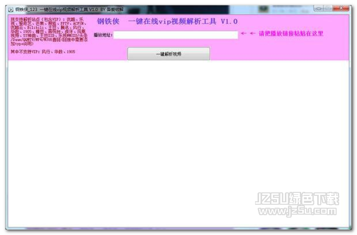 钢铁侠一键vip视频解析软件是一款非常不错全网视频解析软件。几乎支持所有的视频网站,一键解析VIP视频,高清画质,没有弹窗广告的骚扰。喜欢的用户可以到jz5u来下载钢铁侠一键vip视频解析软件。