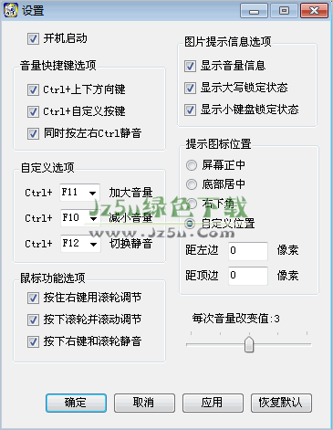 音量快捷键助手允许你使用快捷键来调节系统音量,这比起系统默认的控制方式要方便很多。音量快捷键助手默认采用ctrl + 箭头来控制系统音量的大小或静音,当然,你完全可以根据自己身习惯来自定义这些快捷键。当音量被调节时,屏幕会以图形界面方式显示音量的变化信息。软件还提供了鼠标右键加滚轮来控制音量的快捷方法,比如你可以按住鼠标右键用滚轮调节系统音量大小,而同按住鼠标滚轮和右键即可静音,很是方便!由于软件基于.net开发,所以系统需要安装.net 4.0方可使用