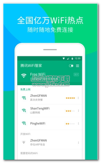 腾讯WiFi管家是腾讯公司旗下的的一款WiFi管理软件,支持上亿公共WiFi热点,无需输入密码就可一键连接,并通过腾讯五星WiFi标准对这些热点进行全方位的安全、连接速度、网络质量等进行全面评估,确保无僵尸、风险、虚假WiFi,安全WiFi,秒连亿万热点,让WiFi连接充满惊喜,独享全国亿万热点,随时随地连接,畅游互联网