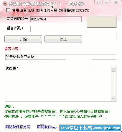陌路无需帐号刷QQ空间留言板是一款无需帐号即可刷QQ空间留言的软件,很多刷留言软件还需要导入小号,而本软件则无需小号就可以。使用也简单,只需要填上要留言的qq号和留言的次数,点击开始即可。