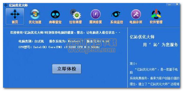 亿M优化大师是一款不仅可以清理系统垃圾还可以进行鉴定病毒、修复漏洞、监控系统、管理软件等功能的操作。还可以一键修复常见的电脑问题。欢迎有兴趣的朋友前来jz5u下载使用!