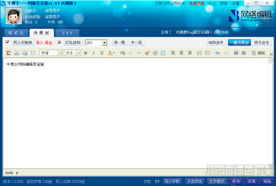 牛博士网编百宝箱是一款好用的网站优化管理软件。牛博士能够为用户提供数据查询、更新词库、格式化等功能,有效的帮助用户管理编辑网站信息,是一款非常棒的网络优化软件。喜欢就来jz5u下载使用吧。