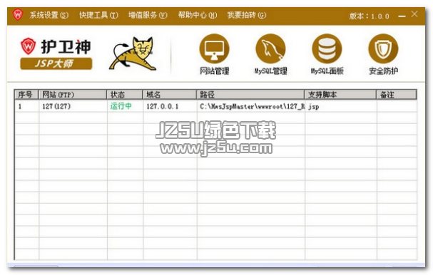 护卫神JSP大师是一款可以一键自动安装和配置JSP。以及Tomcat+MySQL+FTP+SQL-Front,并支持统开设多个JSP网站和建立多个MySQL数据库,帮助用户轻松搭建JSP网站。