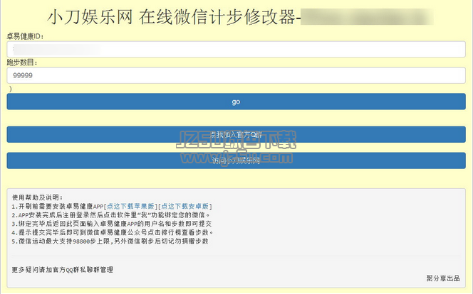 小刀微信计步修改器是一款简单好用的手机QQ和微信运动的步数修改器软件。无需下载,直接进行修改,用户只需输入卓易健康ID和需要修改的步数即可进行微信运动步数修改,非常简单方便。需要的朋友欢迎来jz5u下载使用。