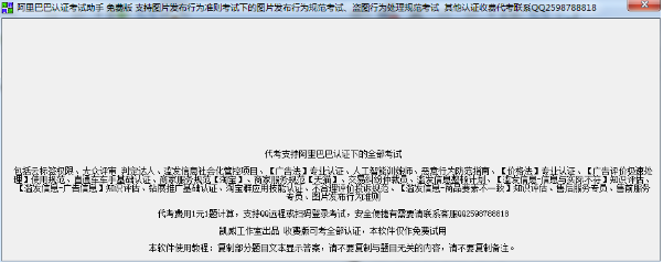 阿里巴巴认证考试助手是一款针对阿里巴巴考试所开发的认证考试辅助工具。害怕认真考试通不过怎么办呢?这款阿里巴巴认证考试助手帮助用户用于阿里巴巴图片发布行为准则认证考试提示答案辅助通过考试。软件仅作试用,仅适用于图片发布行为准则下的图片发布行为规范考试、盗图行为处理规范考试,欢迎。