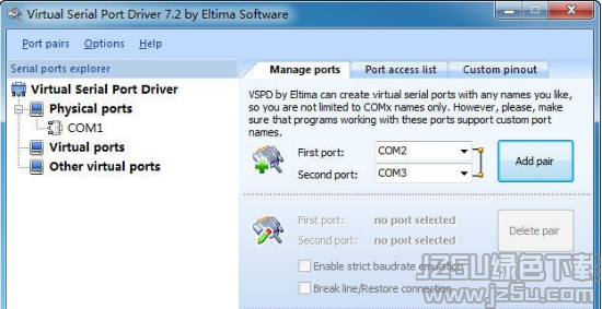 然后选择端口号(可随意),如COM1、COM2,其它选择好后点击Add pair 按钮,就创建了一对端口(在软件右面可看到),当然可以根据需要创建多对。
