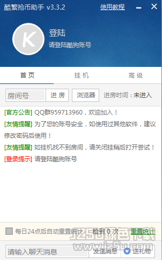 酷繁抢币助手是一款非常实用的直播辅助软件。你还在为没有好的直播辅助而苦恼吗?小编推荐你使用这款软件!它可以帮助用户全自动的抢币,该最新版支持智能进房,自动挂机等等,操作非常的简单,绿色使用。非常不错的一款软件,如果您有需要可以在jz5u下载这款酷繁抢币助手。