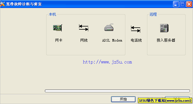 宽带故障诊断与修复工具是一款、绿色、小巧、实用的宽带故障诊断、修复软件。其功能灰常的单一,就是用于个人宽带故障快速检测与修复。可以检测连接网络的一切设备故障,如:网卡,网线,adsl mmodem,电话线以及与远程服务器的连接!故障检测比较明晰!