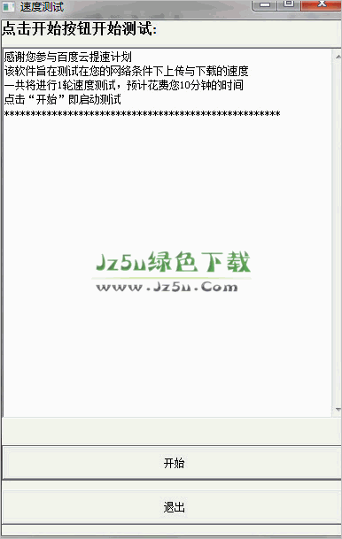 感谢您参与百度云提速计划,该软件旨在测试在您的网络条件下上传与下载的速度一共将进行1轮速度测试,预计花费您10分钟的时间点击开始即启动测试