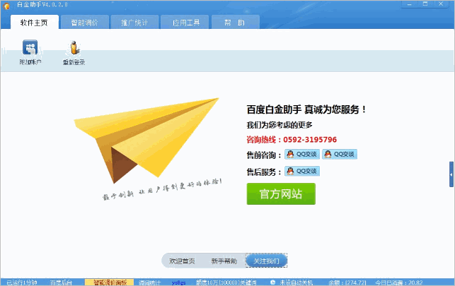 百度白金助手是专业的智能竞价软件,能同时进行推广优化、批量智能调价、批量查询排名、对分析竞争对手、查询具体的推广信息以及数据导入导出等便捷的功能。
