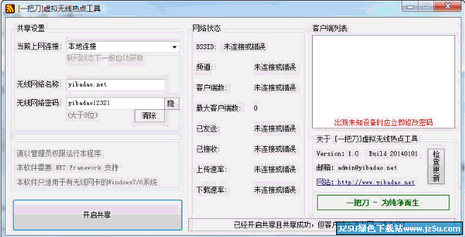 一把刀虚拟无线热点工具通过创建无线热点共享本机当前网络。可自动获取当前连接网络的网络连接,并可显示客户端MAC地址、流量统计以及上传/下载速率。