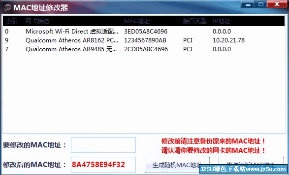 MAC地址修改器是一款可以全自动扫描网卡地址,修改多处网卡地址,不需要重启电脑,高效快速。具有自动生成mac地址,备份旧mac地址的功能。