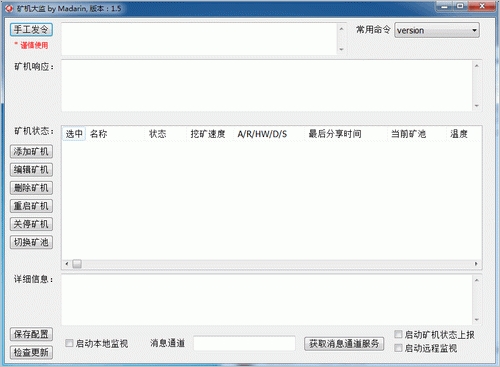 矿机大监是完全、绿色的矿机监控软件,可以监视软硬件挖矿机的运行状态,也可以对矿机发送各种控制指令。