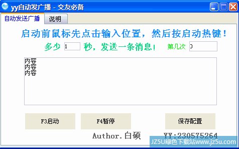 白硕yy自动发送频道广播yy交友必备,是一款可以自动发送yy频道广播,代替手动的软件。