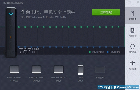 路由器助手是家庭必备网络管理工具,支持几乎所有的路由器,360家庭网络一看便知,发现蹭网设备想踢就踢,病毒木马不再怕吗,黑客入侵称为传说,网络分配不均,限速下片更加有爱。欢迎大家来jz5u下载体验!