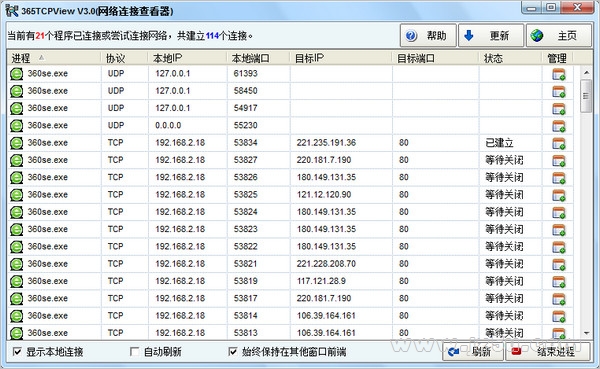 365TcpView是一款体积小巧、功能简单实用的网络连接状态查看工具,可以为您显示系统中的所有TCP 和UDP 端点的详细列表,其中包括本地和远程地址以及TCP 连接的状态,用户可以通过导购网查看是否存在未经许可的连接,发现木马并结束进程。让木马无处藏身。
