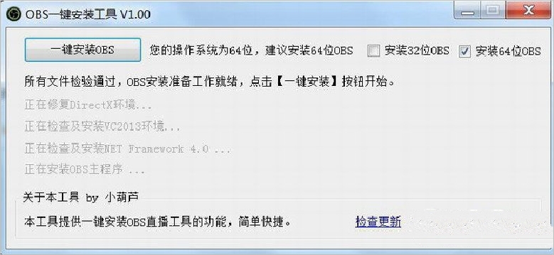 2:省心,相关环境自动检查及安装,OBS出错几率大大下降,后续安装插件也更顺心。