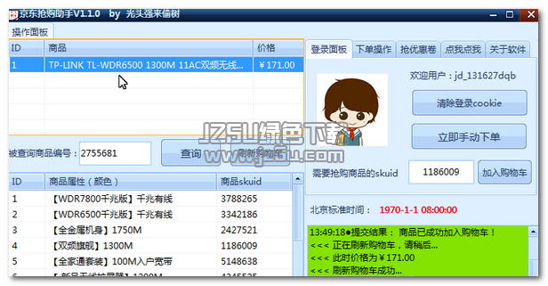 光头强来偷树京东抢购助手是一款支持购物车抢购、商品编号抢购两种方式。可以帮助大家在京东上抢购自己需要的商品工具。特别适合在京东做活动或秒杀的时候使用,软件方便简单,欢迎下载。