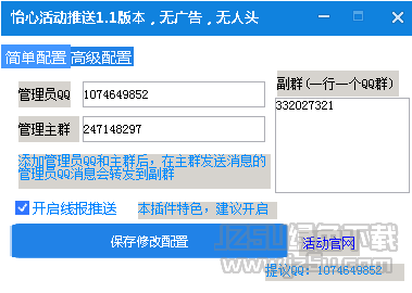 怡心活动推送软件是一款非常实用的线报机器人软件。软件适合淘宝客管理多个群,或者你有多个群需要发通知也可以用这个。简约简单,配置方便,不影响后续其他插件使用,易语言编写,框架为IR机器人。非常不错的一款软件,如果您有需要可以在jz5u下载这款怡心活动推送软件。
