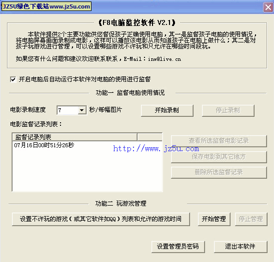 F8电脑监控软件V2.1是一套指导孩子正确使用电脑的辅助工具,将孩子用电脑时的电脑屏幕画面拍摄成电影,并有限制游戏以及聊天等各种软件的使用功能;您可以通过该电影而监督和指导孩子对电脑的使用。软件一旦开始监督则必须要管理员密码才能退出,并且无法强制结束,所以可以保证将孩子使用电脑的整个过程拍摄下来,保证受到限制的游戏和QQ等聊天软件无法在不允许的时间内运行。让父母知道孩子在用电脑做了些什么,上了什么网站,看了哪些内容的网页,和哪些人进行了聊天等等,从而增加对孩子的了解并对孩子进行引导。