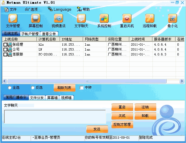 3.批量管理电脑:可以同时关闭、重启或注销多台电脑,方便公司电脑的统一管理。