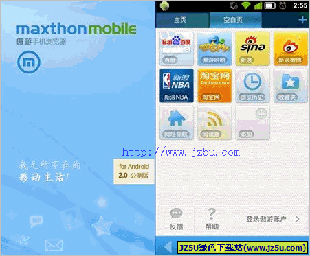 傲游手机浏览器推出android平台版本,支持多标签浏览,同时 兼容1.5\1.6\2.1\2.2多个版本,并具有项加密保护功能。遨游手机浏览器延续pc版的特色,支持独特手势操作,可充分发挥触摸屏的优势。傲游手机浏览器还内置网络收藏服务,可实现rss离线阅读及订阅,同时支持下载图片、软件、音乐等多格式的文件