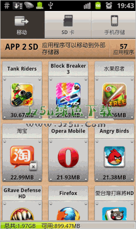 App 2 SD能够找到系统上的应用,并轻松移动到sd卡上,很显然看到这个软件的名字App 2 SD就知道是干啥用的,一款能够找到Android系统上的应用程序,并把它轻松移动到sd卡上,从而帮助您获得更多的宝贵机身空间,适用于Android 2.2版本及更高版本!