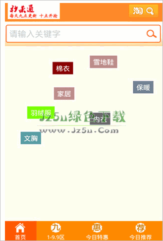 每天10点,38款优质特价产品准时开抢。一元秒杀,9.9包邮,今日特惠,今日推荐,积分兑换,游戏赚宝,任务赚分,快乐享不停,准时相约秒杀通。