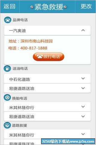4.紧急救援一键拨号:收集了最常用的紧急救援电话,如换胎、送油、道路救援、保险电话等,并提供一键拨号。
