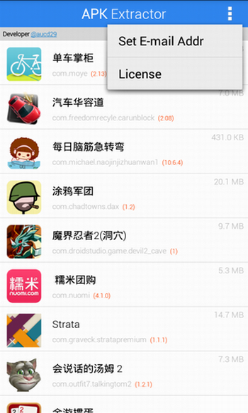 前面已说过APK提取器(Apk Extractor)的功能非常简单,打开后界面也非常的简洁,直接显示的是已安装的程序名称,程序的版本号用红色字体显示,显得比较用心。点右上角的选项按钮可以设置默认的EMAIL,点程序可选择提取已安装程序到SD卡还是通过EMAIL发送。
