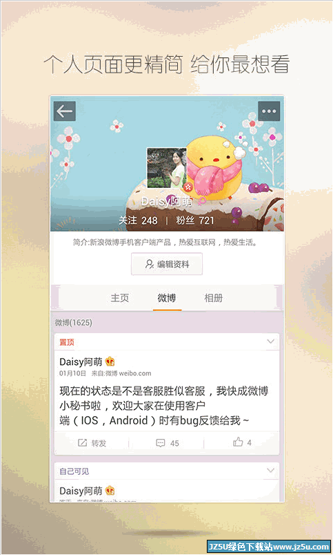 新浪微博4G 5.0.0①支持群组 聊天 ,畅所欲言; ②定向发布仅自己可见,拥有私密 空间 ; ③定向发 微博 ,给懂的人分享; ④小尾巴支持自定义,变身壕无压力!