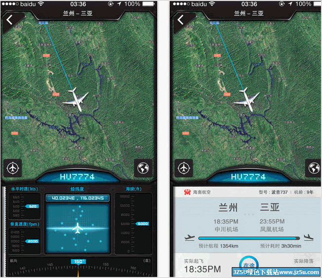 百度天眼将数据实时、真实呈现,可以根据地理位置显示出周围天空中正在飞行的航班,用户可以通过点击小飞机图标,查看具体航班的航班号、出发地、目的地以及当前的海拔、航速、经纬度等信息。用户也可以在搜索框中直接输入想要查询的航班号进行搜索,同样可以进入到该航班的具体信息界面。除了这些飞行状态信息之外,百度天眼还能够显示每一架飞机的实际飞行轨迹,比如前段时间北京雾霾影响到首都机场的航班降落,通过百度天眼你就可以看到当时很多航班在北京周围的空中多次盘旋的航线轨