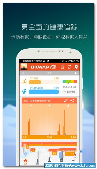 5.强大的全天候自动计步 持续记录您的运动步数,还可用GPS记录运动轨迹,与好友分享。