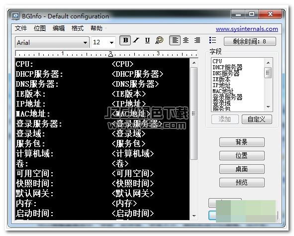 Bginfo中文版是一款强大的桌面应用管理软件,帮你更好的整理自己的电脑桌面文档及设置。自定义添加桌面备忘信息,包括系统CPU型号、磁盘剩余空间、系统启动时间、本机IP等信息显示,欢迎来jz5u。