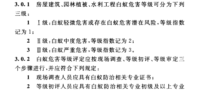 本标准共分7章和3个附录,主要技术内容包括:总则、术语、基本规定、房屋建筑白蚁危害等级评定、园林植被白蚁危害等级评定、水利工程白蚁危害等级评定、白蚁危害地区评定等。