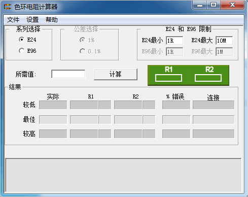 假设你正在设计一个精密的均衡电路。你知道,在相当范围限制只有1%精度的电容,他们是昂贵的,所以你不想平行值。你选择一个特定的电容值,并决定所需要的电阻值。电阻值总是不完全下降到标准值,但是这不是一个问题,因为电阻很便宜,所以你不介意使用两个电阻的组合。问题是要找到您所需的价值匹配的标准值的最佳组合。色环计算器解决了这个问题。您只需告诉它所需的值,选择可用标准电阻范围色环计算器找到的最佳组合,并计算您所需的值的设计错误。