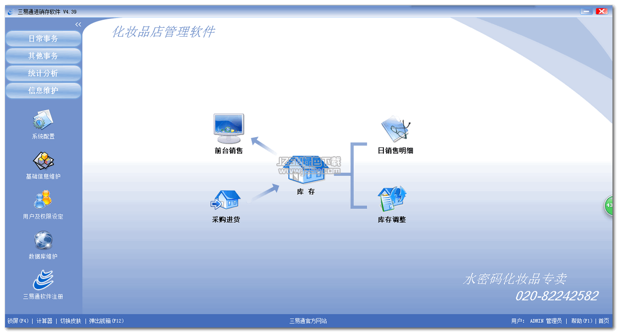 三易通销售管理软件系统、化妆品店管理软件(www.sanyitong.cn)、是专门针对专卖店收银软件,适合在化妆品、五金店、家纺、母婴用品、烟酒、皮具、服装等行业店铺销售领域的零售或批发使用,充分满足各行业收银管理软件个性化、特色化、简洁化、傻瓜化的特点。
