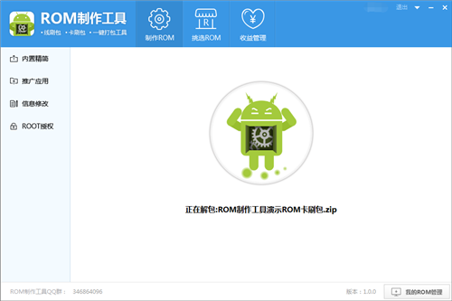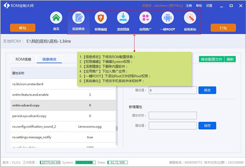 3、解包完成后,即可在【信息修改】下修改ROM配置信息、【权限编辑】下编辑System权限、【深度精简】下删除内置软件、【应用推广】下加入推广应用、【一键ROOT】下添加Root文件获取Root权限、【系统美化】下修改手机系统字体和铃声等等。