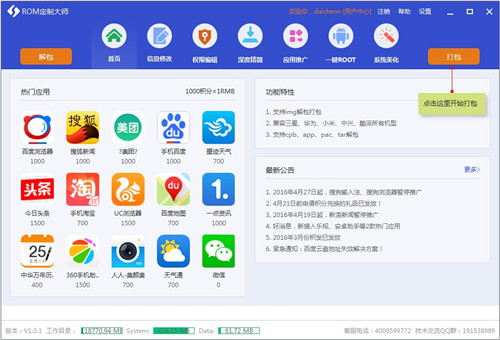 1、一键批量制作线刷包和卡刷包、智能解包封包预装,支持多种专业ROM定制功能,提供优质手机分发服务;