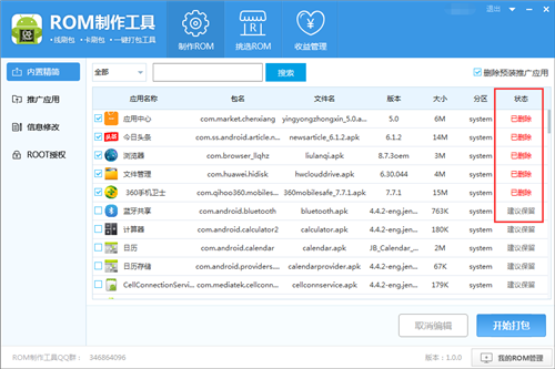 4、编辑完成后点击【打包】即可保存所有的修改并打包ROM到本地。