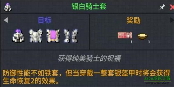 3、前期建议带上你的石镐和,去附近的浅层矿洞寻找银矿,银矿石并不算稀有,从地表到深板岩区域都有它的身影,总之多收集一些然后制作银甲,这样你就拥有了永久的生命恢复2,这样除了食物外就有额外的回血方式。