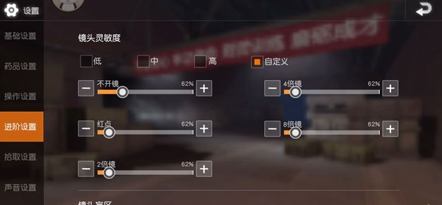 ㈤镜头灵敏度:自定义将所有灵敏度调整为62%,也可随意调试百分比至舒适程度。(同灵敏度可避免不同装备操作产生的差异,减少不适应性)
