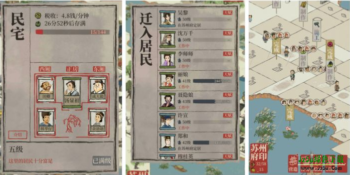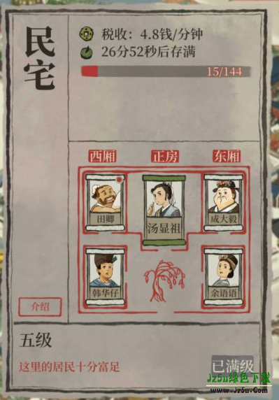 没错,民宅的好处在于,其他水井、画院都是每次要点生产才能出铜钱,而民宅只要你设置税课司,它就会一直自动帮你收铜钱。所以尽可能都升满级。如图5级民宅收入