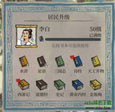 居民——随便选一个人物点进去——点等级那一栏旁边的加号。红心的是喜欢看的书,看对了书加经验多。薄的书加少量经验,厚的书加大量经验。