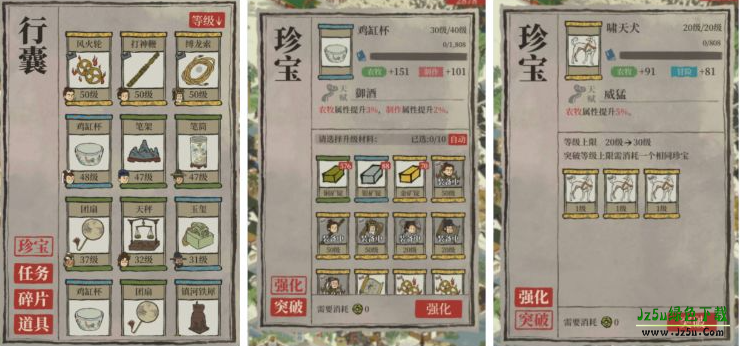 个人是选择锦上添花类型,就是把人物属性特/优的配备相同属性的珍宝,比如董其昌在制作和理财方面好,我就会配有这两个属性的珍宝。给人物佩戴之后,界面有【珍宝】选项,点进去就可以给珍宝强化了