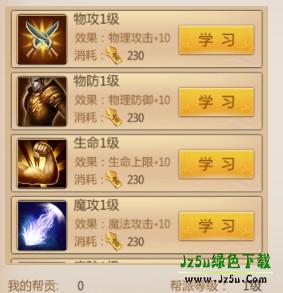 帮派成员可以在帮派中学到各种辅助技能,可以增加自身的攻击、防御、生命等属性,让玩家变得更加强力。
