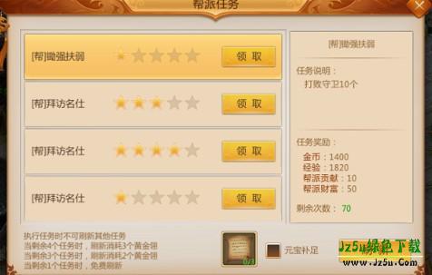 7、帮派任务每周70次,着急升级的玩家可以一天做完,也可以每天做一点知道周日做完70次即可。