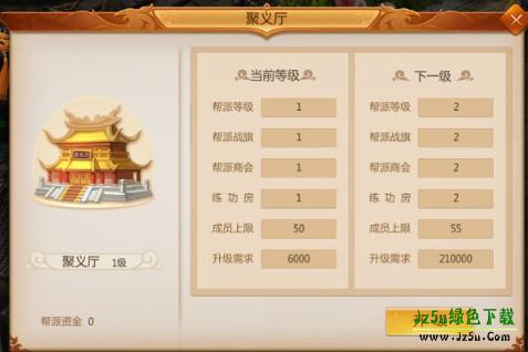 当“聚义厅”等级提升的时候,帮派等级、帮派战旗、帮派商会、练功房等建筑的等级也会提升。
